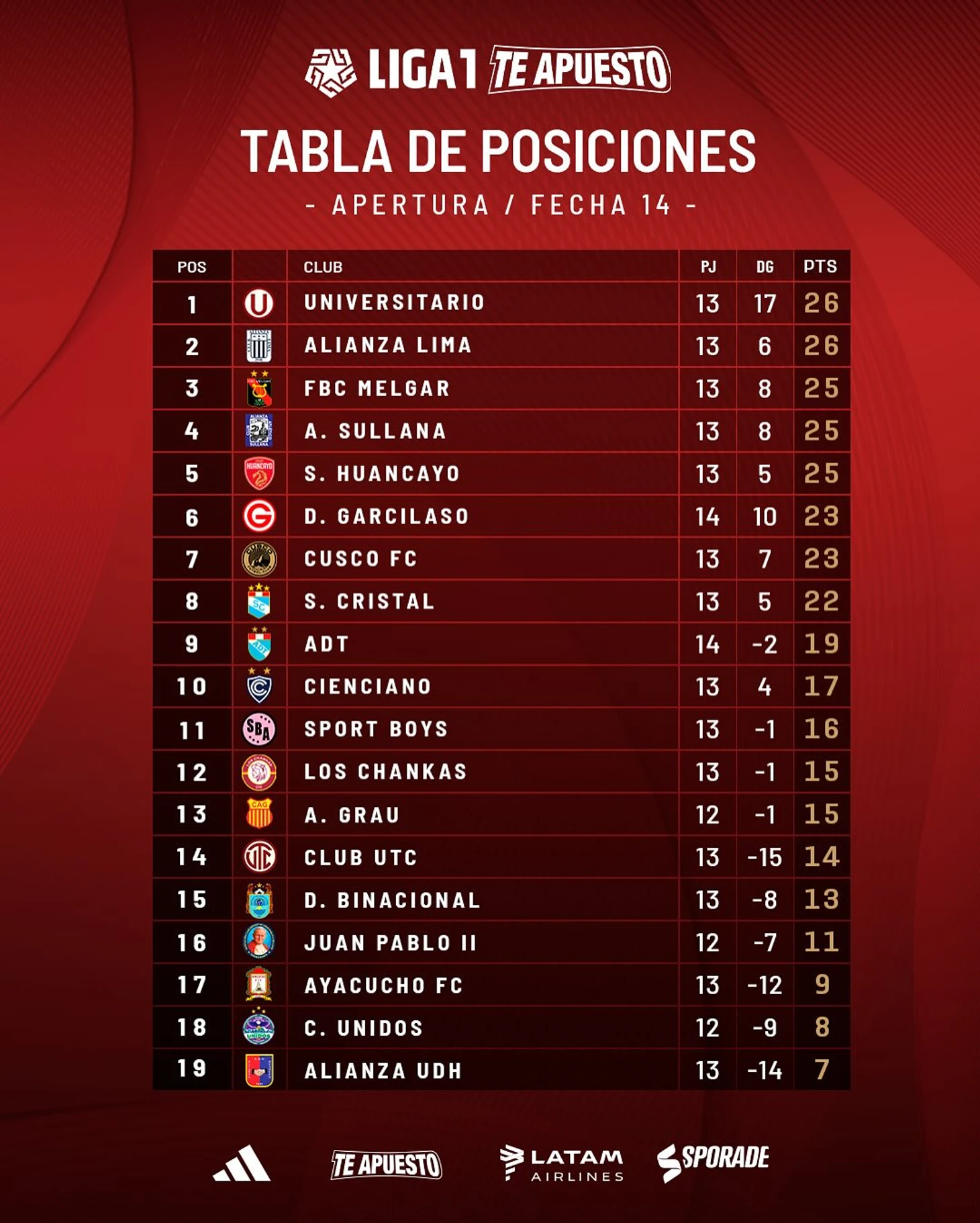 Спад лидеров привел к тому, что в первой половине таблицы образовалась невероятная плотность. Первую и восьмую команды разделяет всего 4 очка. Вверху таблицы появились неожиданные имена: «Альянса Атлетико» и «Спорт Уанкайо».