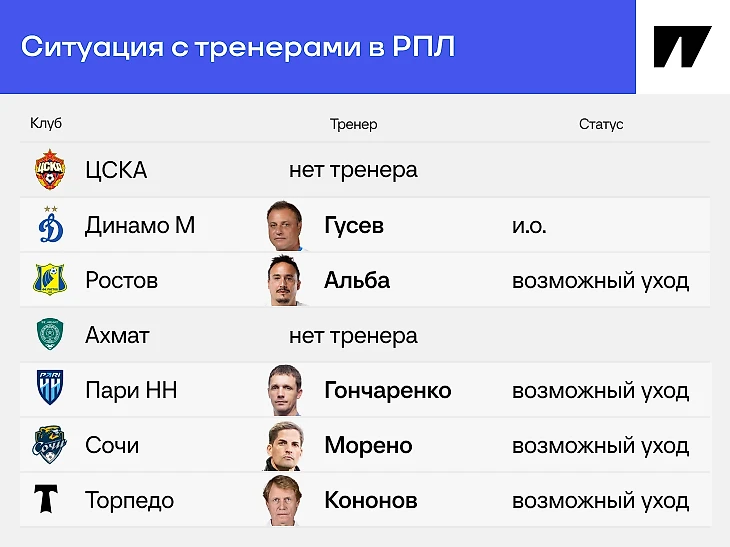 ЦСКА остался без главного тренера после ухода Марко Николича. Подобная ситуация и у «Ахмата», в некоторых других клубах тоже неопределенность. Хотя до следующего чемпионата осталось не так много времени.