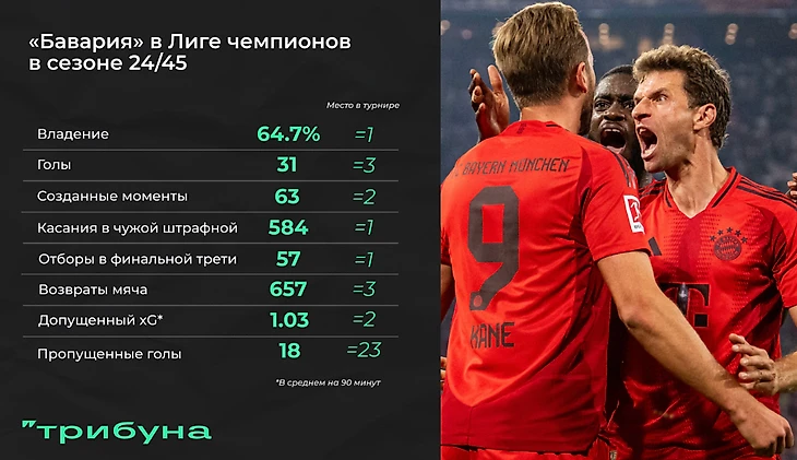 Для наглядности посмотрим на статистику команды в Лиге чемпионов. «Бавария» идет в лидерах турнира по владению, касаниям в чужой штрафной, касаниям соперника в своей штрафной и по возвратам мяча. А еще мюнхенцы стали третьей лучшей командой турнира по допущенном xG.