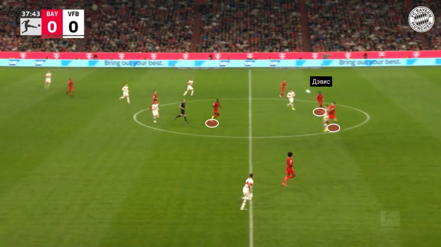 С одной стороны, Венсан точечно адаптируется под соперника в отдельно взятых матчах. Лучше всего показать это на примерах. Первый, после матча с «Айнтрахтом», где Мармуш и Экетике разорвали центр обороны «Баварии», Дэвис стал куда чаще оставаться в более низкой позиции, чтобы быть готовым к контратакам.