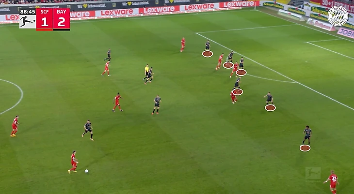 При необходимости «Бавария» спокойно могла отойти в оборону. Один из примеров – последние полчаса игры против «Фрайбурга». Оборонялся даже Харри Кейн, который садился чуть ли не шестым игроком в оборону. Тоже самое можно было увидеть и в ответном матче против «Байера» в Лиге чемпионов.