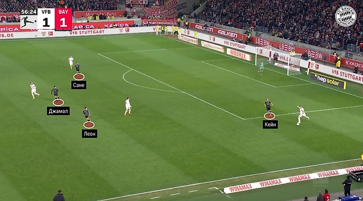 Другая ситуация, февральский матч со «Штутгартом» – «Бавария» проигрывала центр поля и зону подбора весь первый тайм. Соперник выглядел лучше. В перерыве Компани поменял систему прессинга: вместо Мусиалы к Кейну стал подниматься Сане, оставляя крайнего защитника на фланге относительно свободным.