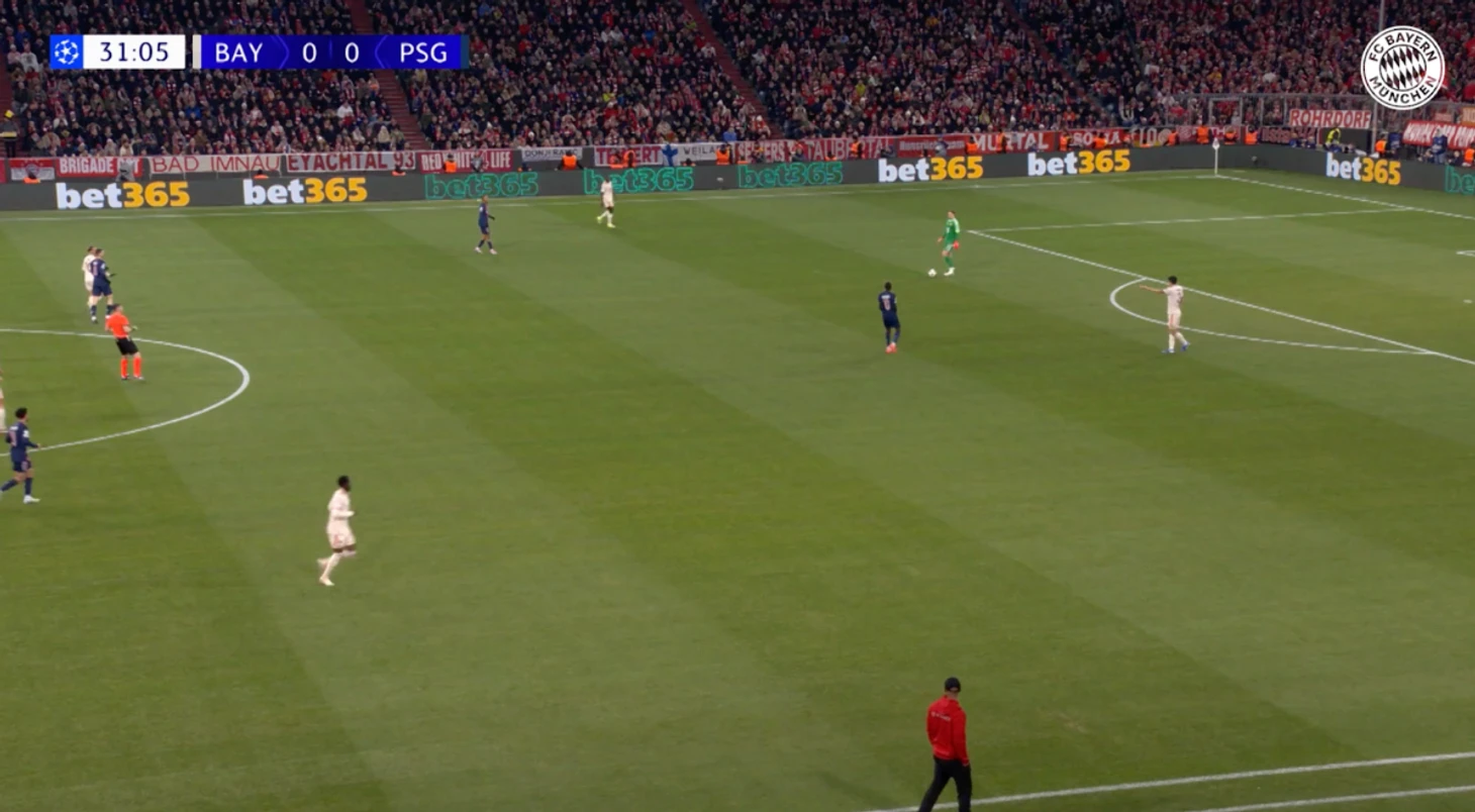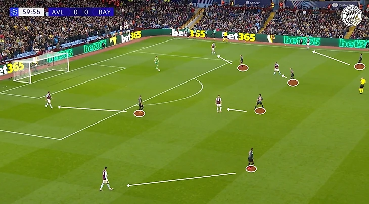 Немаловажную роль играют крайние защитники – они часто не занимают фланг, а остаются в более узкой роли (как минимум один, иногда сразу оба). С одной стороны, это дает дополнительную опцию для розыгрыша и продвижения мяча. С другой, таким образом мюнхенцы насыщают центр поля на случай потенциальной потери мяча, и сразу готовы к контрпрессингу.