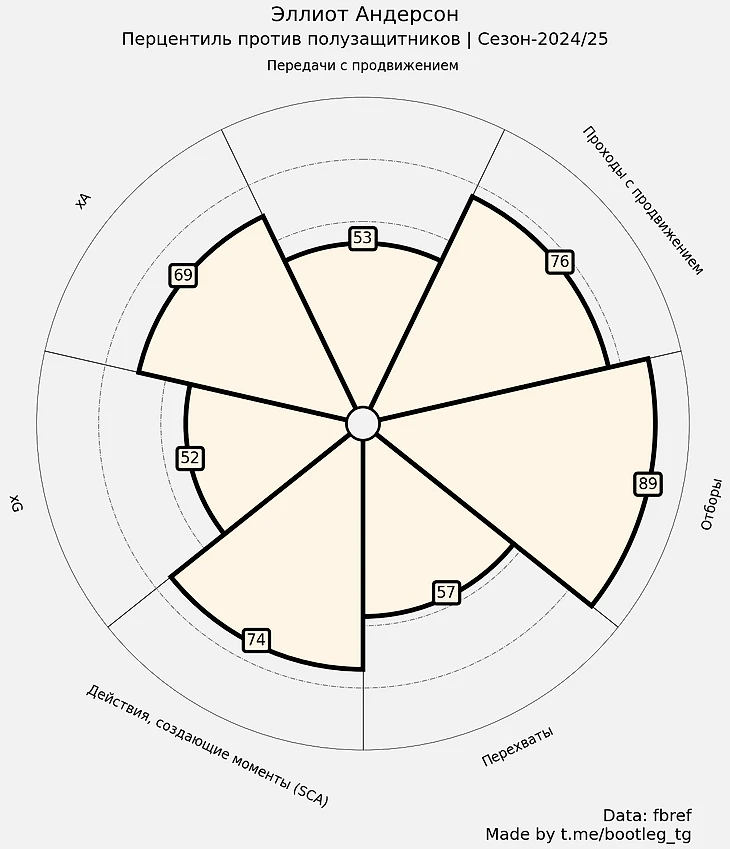 Эллиот Андерсон — один из невоспетых героев АПЛ этого сезона. Парень был надеждой возродившегося «Ньюкасла», но из-за PSR уехал в «Ноттингем» за 40 млн. Тут парень сполна раскрылся: оформил 2+6 и при этом был полезен в оборонительных действиях как второй опорник.