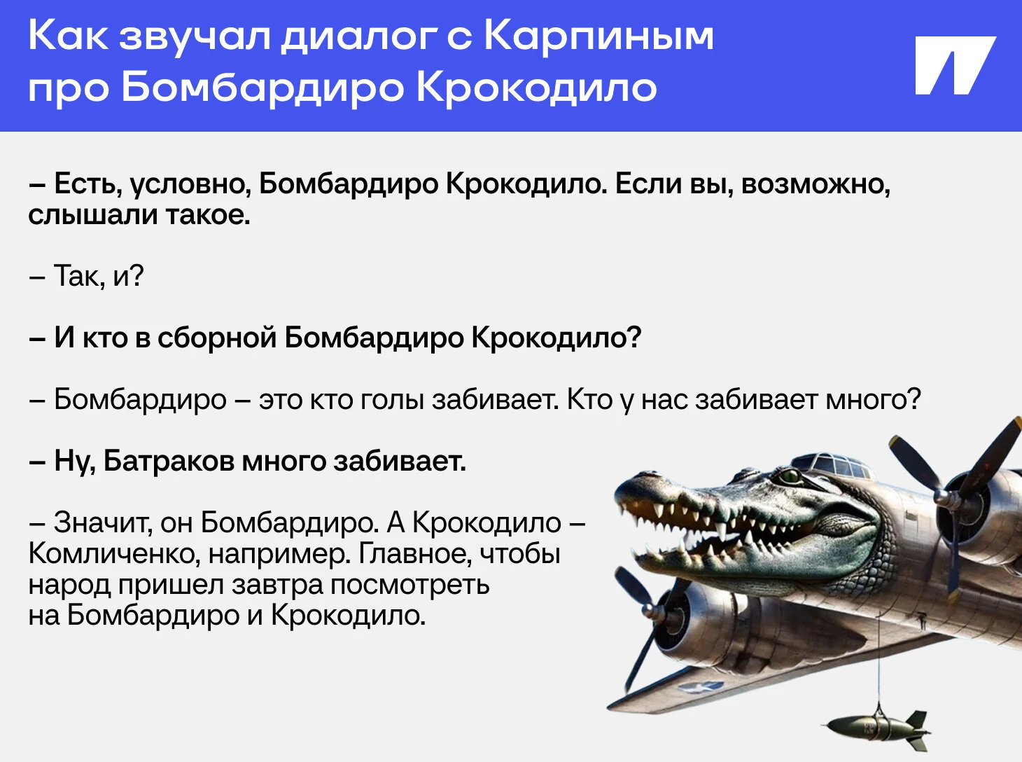 – Ты повторил перформанс через несколько месяцев и спросил про Бомбардиро Крокодило. Но этот мем сборная Росси не упоминала. Откуда тогда взялся вопрос?