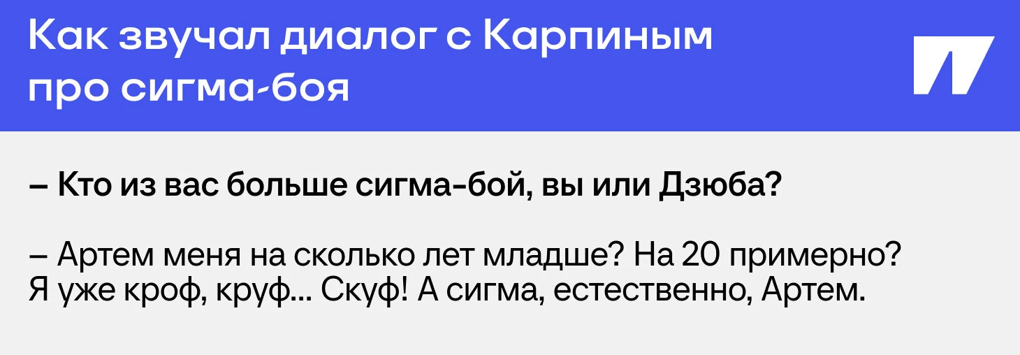 – По моим ощущениям, Валерий Георгиевич шарит в трендах, общается с молодежью. Я подумал, что это неплохая идея. Но проблема, что прямо передо мной Никита спросил про Бомбардиро Крокодило. И два таких вопроса подряд – уже не очень. Получилось немножко вторично. Я ведь еще не совсем удачно сформулировал. И Карпин, когда слушал вопрос, сидел с фэйспалмом.