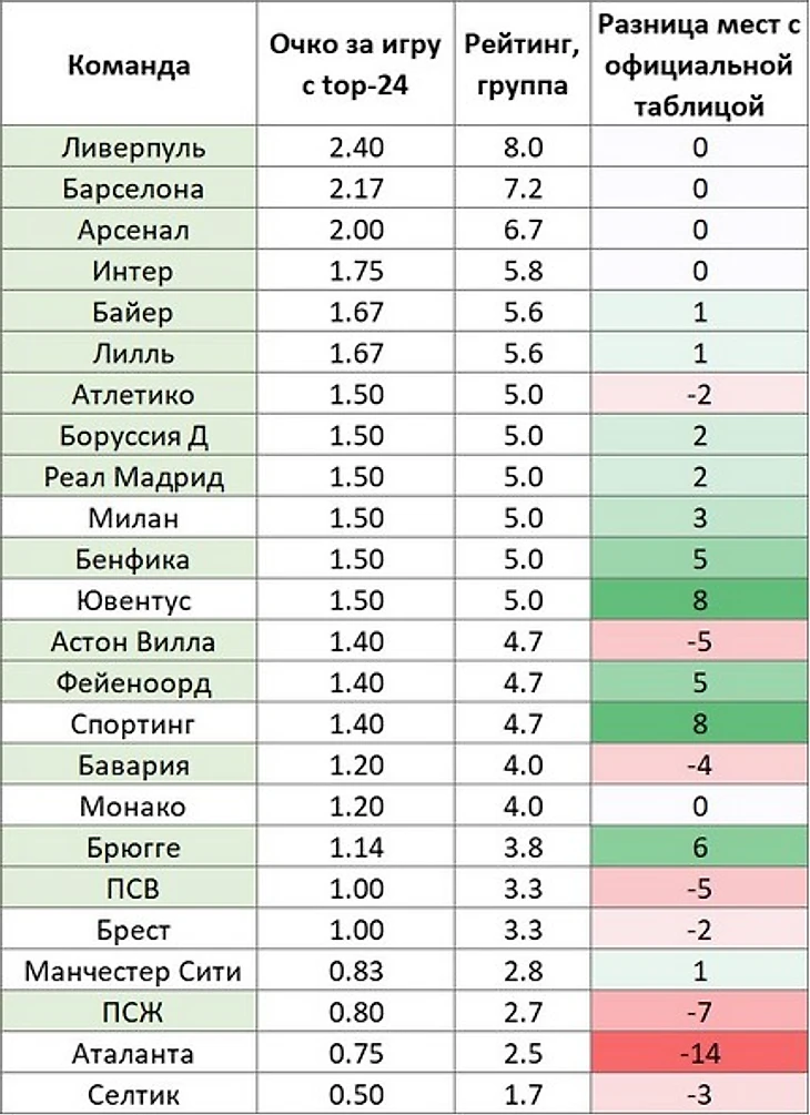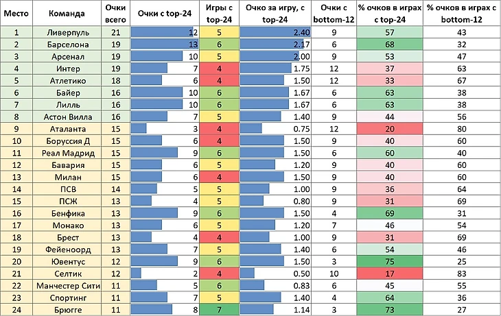 3) Первая четверка по общим очкам не отличается от первой четверки по средним очкам за игру с топ-24 (Ливерпуль, Барса, Арсенал, Интер), а вот после них начинаются флуктуации, которые разберем далее.