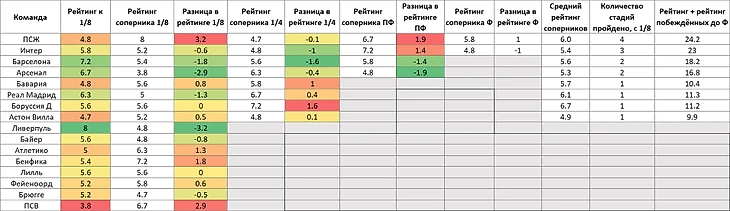 Опять же можно заключить, что в целом лучшим по сезону в ЛЧ командам достались более слабые по сезону ЛЧ соперники – это видно по «зелености» верхней части колонок «рейтинг соперника» и «разница в рейтинге» и «розовости» нижней части. При этом Арсенал получил самого слабого соперника, а ПСЖ – самого сильного.