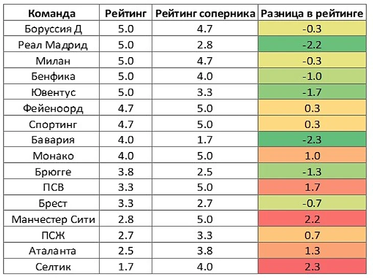 В целом можно заключить, что клубы с более высоким рейтингом получили более слабых по текущему сезону соперников, о чем говорит преобладание зеленого в верхней части таблицы (столбец «разница в рейтинге») и красного – в нижней. Из нижней части относительно повезло только Брюгге и, хаха, Бресту. Из верхней части больше всего «подфартило» на бумаге Реалу, Юве и Баварии.