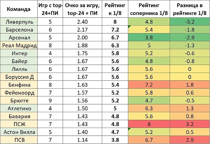 Теперь – главное, для чего это все и затевалось – давайте посмотрим «справедливость» пар 1/8 на основании не нашего абстрактного представления о силе клубов, а с учетом их действительного выступления на этапах группы и плей-ин. В этой таблице – обновленные числа для количества игр и средних очков с топ-24, плюс – обновленный рейтинг.