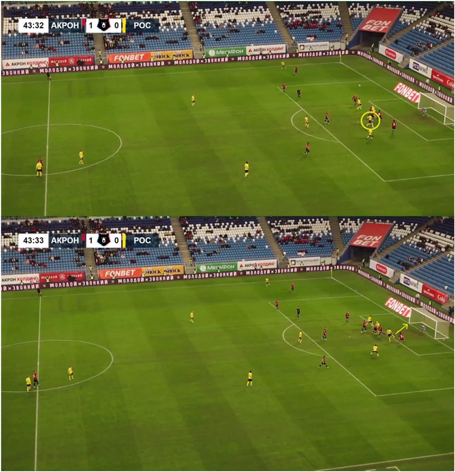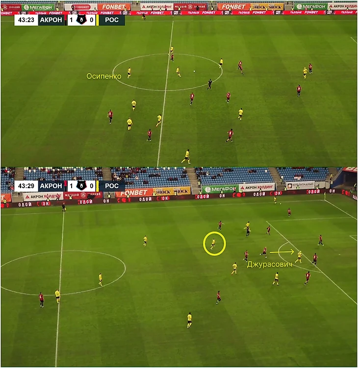 В момент начала атаки дальше Осипенко от ворот «Акрона» только Артем Дзюба. Уже через 6 секунд после перевода Константина Кучаева на Илью Ваханию Максим ускорится и будет один в опорной зоне – Алекса Джурасович не смотрит за спину и садится в штрафную третьим центральным.