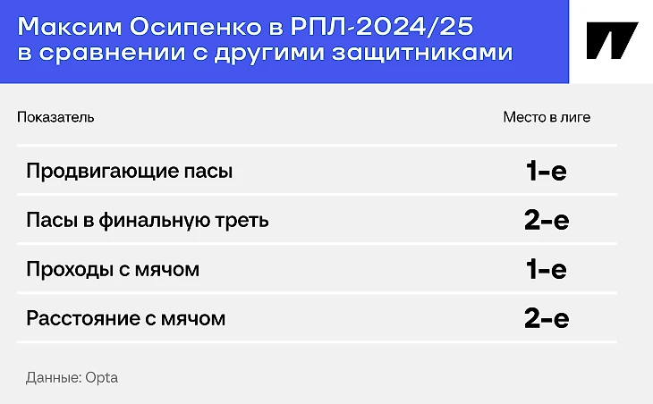 Осипенко – лучший центральный защитник РПЛ по продвижению мяча, а по передачам в финальной трети спокойно конкурирует с атакующими топами лиги.