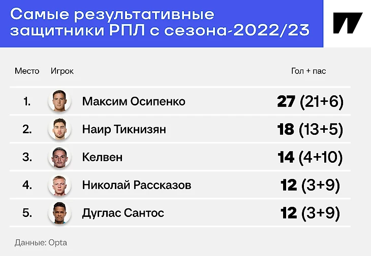 Классный факт: Осипенко забил 9 мячей в прошлом сезоне РПЛ и повторил рекорд результативности для защитников в чемпионатах России (столько же выбивали Виктор Онопко в 1993-м, Юрий Никифоров в 1995-м и Денис Колодин в 2007-м). За последние три сезона у Осипенко 27 (21+6) результативных действий в РПЛ. Для сравнения: у Ивана Облякова и Андрея Мостового по 30. В «Ростове» за этот период результативнее только Николай Комличенко (22+11), хотя по голам почти равенство.