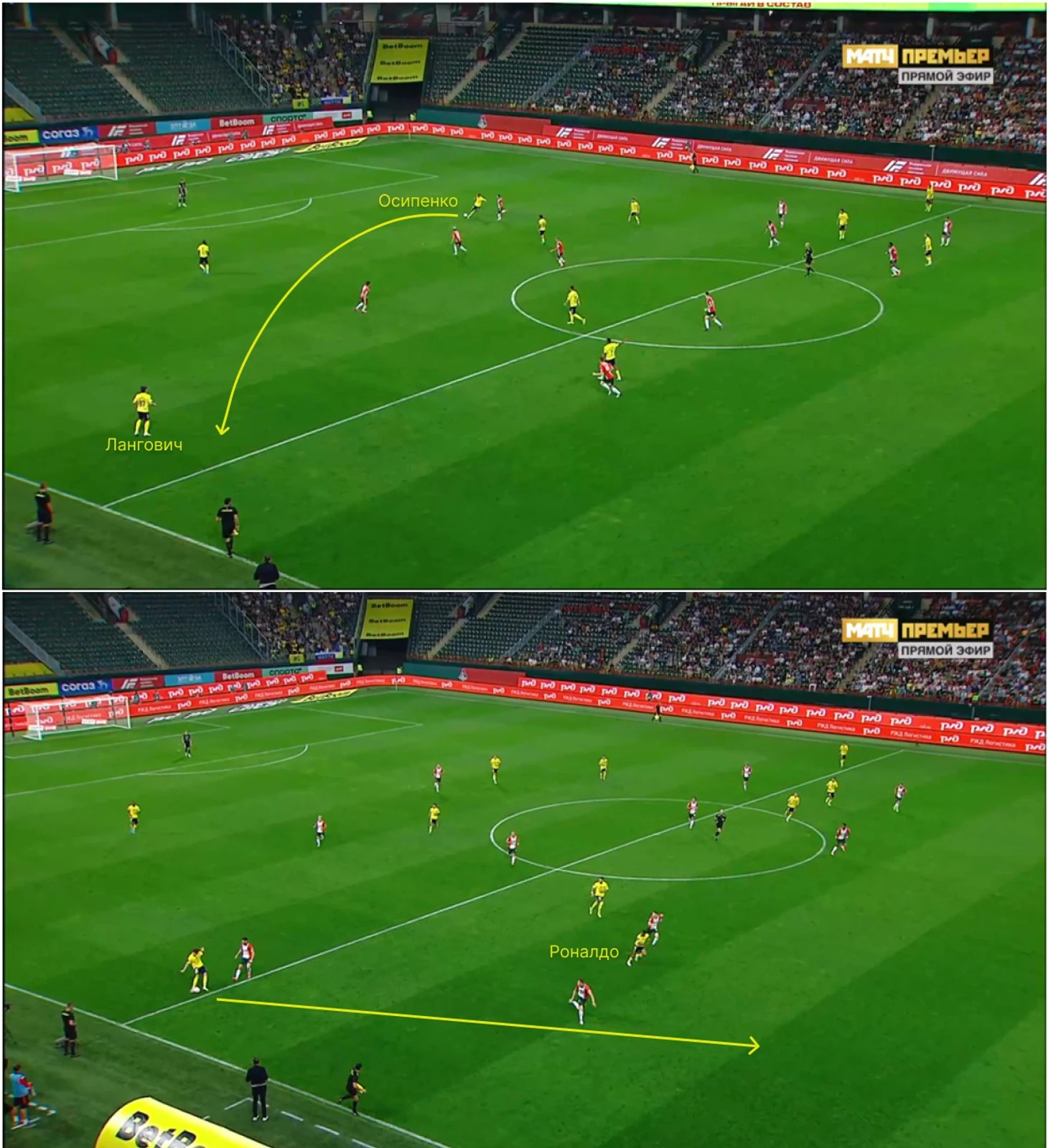 В итоге именно на позиции левого центрального защитника у Валерия Карпина Осипенко превратился в одного из лучших продвигающих игроков лиги. Есть несколько приемов: