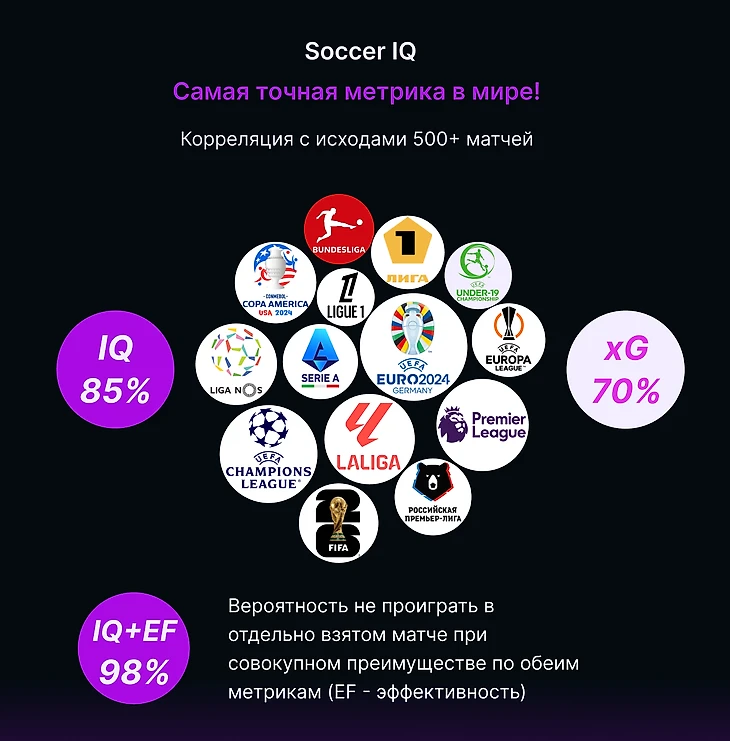 Soccer IQ, как главная метрика методики, отражает общее качество игры команды относительно стандартных для современного футбола значений