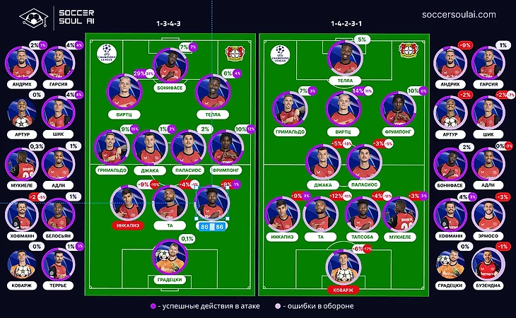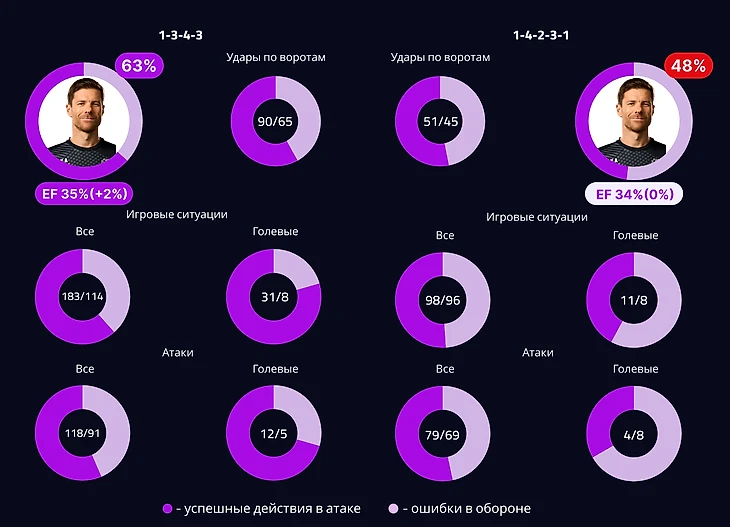 Другая картина по цифрам соперников: в тройке Байер позволял оппонентам чуть больше (SoccerIQ 77% vs 70%), но результативнее соперники были, когда команда оборонялась в четыре защитника (14% vs 33%).