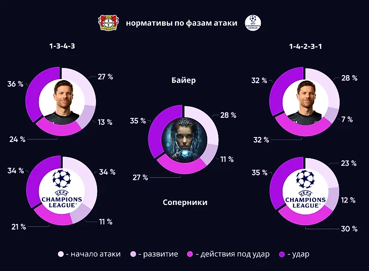 В обеих этих фазах Байер показал более высокий уровень в вариации 1-3-4-3. У соперников эти значения гораздо более близкие и мы видим, что смена схем влияла на фазы атаки самого Байера, но практически не влияла на фазы атак соперников!