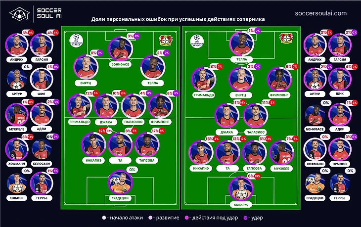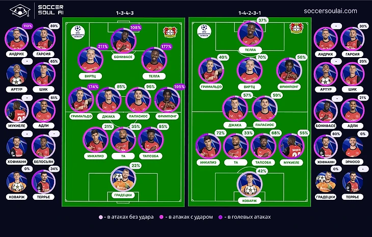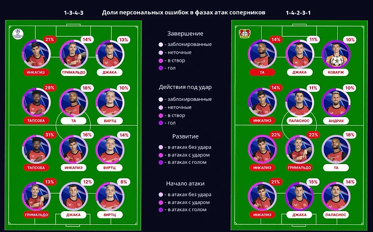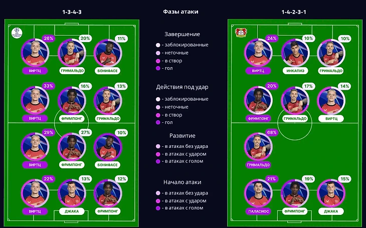 1-4-2-3-1: Здесь уже возможны варианты, Виртц оставляет за собой только лидерство в фазе завершения. Фримпонг – лучший в предударном действии, Паласиос – как начинающий атаки, а Гримальдо по факту – единственный игрок, кто отвечал за развитие атакующих действий и создавал глубину. Но, стоит отметить, что всё это лидерство Фримпонга, Паласиоса и Гримальдо отработало в холостую, поскольку ни одна из этих активностей голевой не стала! Фримпонг в этом контексте был продуктивнее, начиная атаки, а Гримальдо, совершая предударное действие.