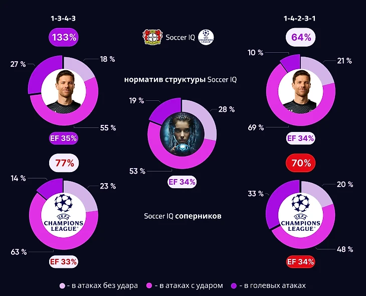 - Байер в Лиге Чемпионов, вне зависимости от схемы, сохранял неизменной эффективность продвижения мяча, которая балансировала чуть выше или чуть ниже норматива (34%), но кардинально отличался по общему качеству игры, которое было на порядок выше при игре в базовой для Алонсо схеме 1-3-4-3 (Soccer IQ 133% vs 68%);