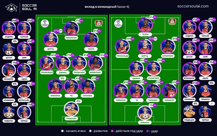В рамках результативного вклада, конкуренцию Виртцу (гораздо более успешную) составил Мукиеле - gIQ 33%. У самого Виртца gIQ 24%, как и у левого фулбека (в такой схеме) – Инкапиэ. То есть 81% голевого вклада у трёх футболистов, два из которых – крайние защитники!