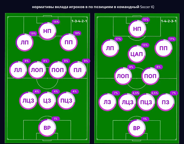 В идеальной картине мира, вклад игроков в общий Soccer IQ для разных игровых позиций в этих двух схемах выглядит так..