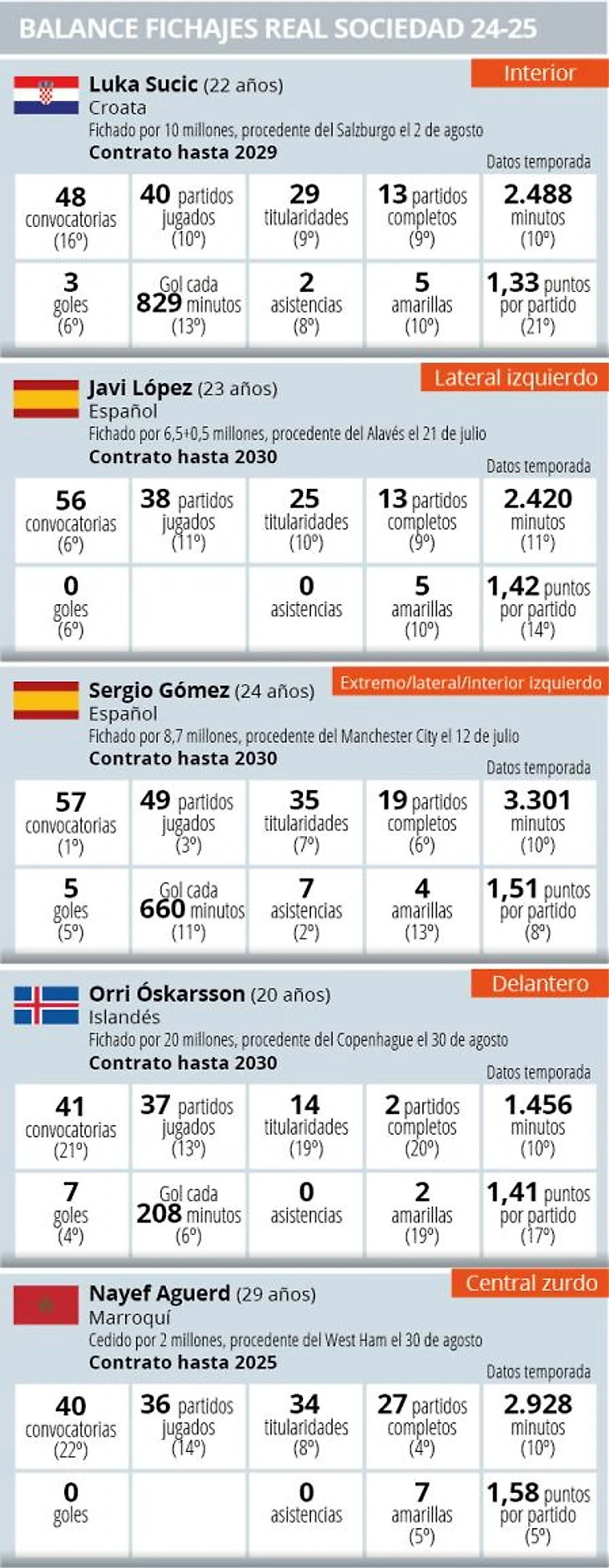 Летние трансферы «Реал Сосьедада» перед сезоном 2024/25, осуществленные под руководством Роберто Олабе и при участии спортивного директора Эрика Бретоса, не оправдали ожиданий. Несмотря на то что большинство новичков получили значительное игровое время, их вклад в команду оказался скромным. Лишь Серхио Гомес проявил себя стабильно, тогда как остальные — Агерд, Сучич, Оскарссон и Хави Лопес — не смогли закрепиться на высоком уровне.