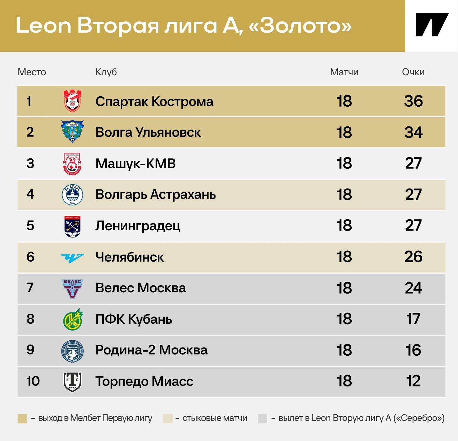 Сразу три команды набрали по 27 очков: кроме «Машука-КМВ», это «Волгарь» и «Ленинградец». Причем клуб из Ленинградской области напоследок обыграл лидера – 1:0 с костромским «Спартаком» благодаря эффектному Максиму Бачинскому. Вонзил головой прямо в девятку!