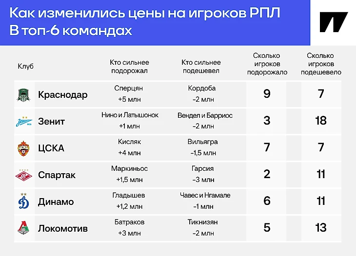 Кто в РПЛ подорожал: у Сперцяна +5 млн, Кисляк и Батраков в топе. А подешевели 18 зенитовцев