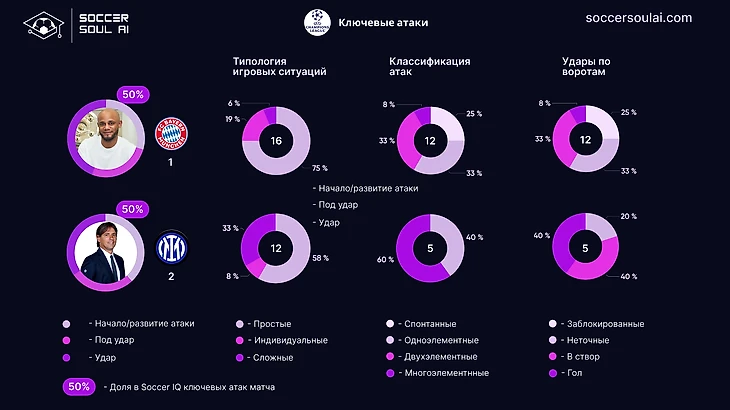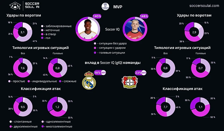 Структурно сумма долей SoccerIQ в ударных и голевых атаках Байера (82%), заметно выше аналогичного показателя Реала (71%), но с точки зрения голевого SoccerIQ команда Анчелотти результативнее (26% vs 22%).