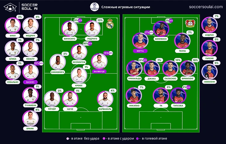 В обеих командах были выраженные лидеры по исполнению сложных ситуаций. У Реала – Вальверде и Васкес, у Байера – Виртц и Гримальдо.