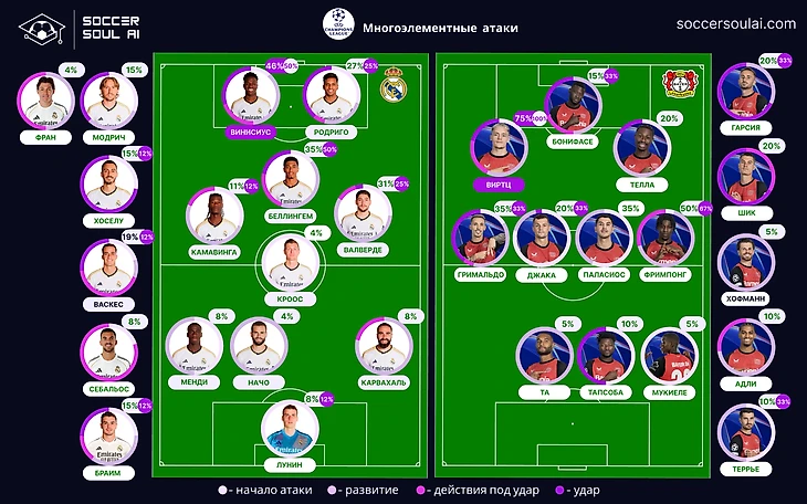 Винисиус и Беллингем приняли участие в более, чем трети всех многоэлементных атак Реала. В Байере таких игроков больше – Виртц, Фримпонг, Гримальдо и Паласиос.