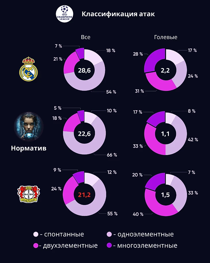 Общее количество голевых атак у обеих команд превышало норму (+36% Байер и +100% Реал), доля многоэлементных голевых атак также у обеих выше среднего (20% и 28%). Заметная разница в более высокой доле двухэлементных у Байера и спонтанных у Реала, что снова намекает на класс футболистов испанской команды, способных как многоэлементность создавать, так и за потерю концентрации наказывать.