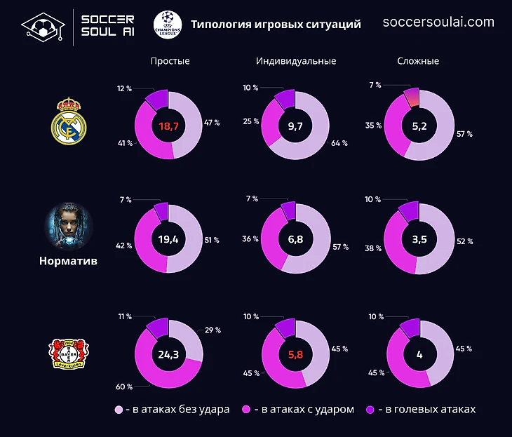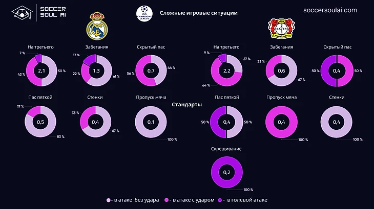 В среднем за игру Реал создавал их на 16% выше среднего, в то время как Байер 5% не добирал. При этом доля сложных ситуаций у обеих команд была выше среднего. Кроме количества Реал отличался еще и высоким процентом индивидуальных элементов.
