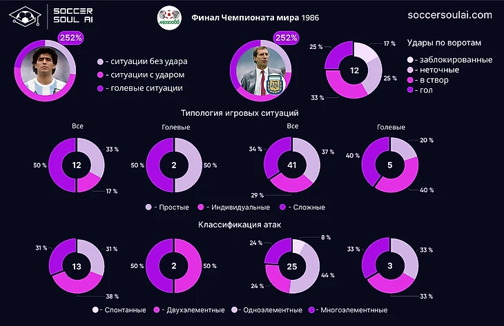 Марадона не просто влиял на маркеры качества, он фактически тащил эти маркеры качества вверх. Несмотря на его потрясающий дриблинг, доля индивидуальных игровых ситуаций игрока составила только 17%, в то время как доля сложных достигала 50%!
