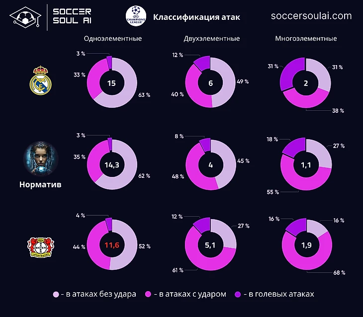 В среднем за игру Реал формировал на 27% атак выше среднего, в то время как Байер 6% не добирал. Здесь картина очень похожа с той, что была при сравнении игровых ситуаций. Доля двухэлементных и многоэлементных атак у обеих команд выше среднего.