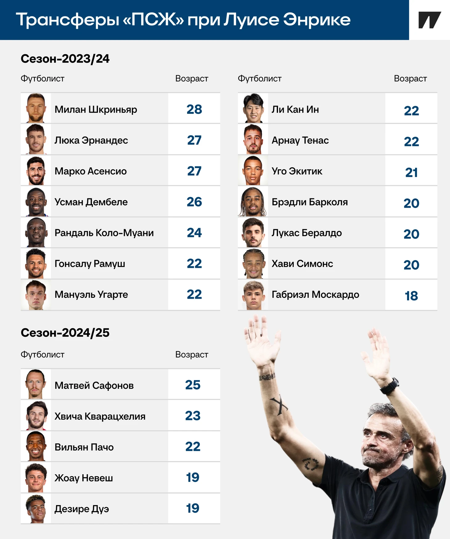 В сезоне-2022/23 перед приходом испанца средний возраст парижан составлял 25,9 лет – не примечательный результат даже по меркам Лиги 1. В сезон-2024/25 «Пари Сен-Жермен» входил уже третьей самой молодой командой в европейских топ-лигах – средний возраст опустился до 23,7 лет. Моложе были только «Страсбур» и «Челси» (обе – по 23,1).