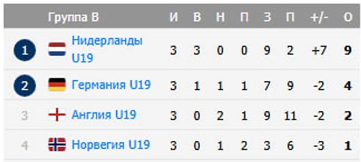 Автор в шоке с обороны Англии — их вратарь Томми Сетфорд пропустил столько же, сколько и основной вратарь Черногории (последний гол на турнире пропускал уже не Милович, а его сменщик Джурович) — и при этом у Англии две ничьи: 2:2 с Норвегией (голы: Уотсон, Мур — Рессинг-Лелесиит, Гранос) и феерическая ничья 5:5 с Германией (голы: Дарвих, Эль Мала (дубль), Мерштедт, Вурм — Кинг, Уитли, Расселл-Денни, Эбботт, Дерри). Эта игра стала самой результативной в истории Евро до 19 лет (с 2002 года) — предыдущий рекорд держался с 2003 года (полуфинал Австрия — Португалия — там был зафиксирован счет 3:6). В третьем туре произошло небольшое чудо — до 85-й минуты Германия проигрывала Норвегии 0:1 (единственный гол к тому моменту забил Сондре Гранос), но немцы за шесть минут (85-я — Уэдраого, 91-я — Эль Мала) смогли забить два мяча и вытащить себя за шиворот, обеспечив плей-офф.