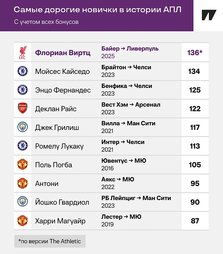 ● Всего «Ливерпуль» выплатит за Виртца около 136 млн евро: гарантированы 117,5 млн евро, еще 18,8 млн – бонусы. По версии Bild, дополнительные выплаты предусмотрены за экстраординарные достижения. Но кто сказал, что Виртц не сделает экстраординарного.