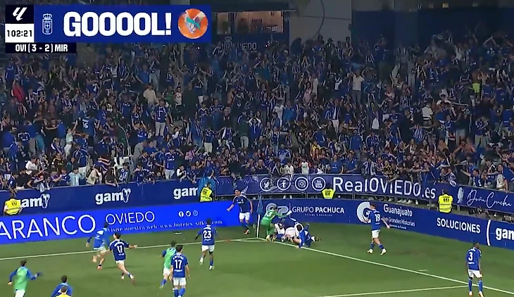 «Мирандес» забил на 16-й минуте – по сумме двух матчей это уже 2:0. Но «Овьедо» в ответ забил три, камбэк начал Санти: на 39-й минуте с пенальти.