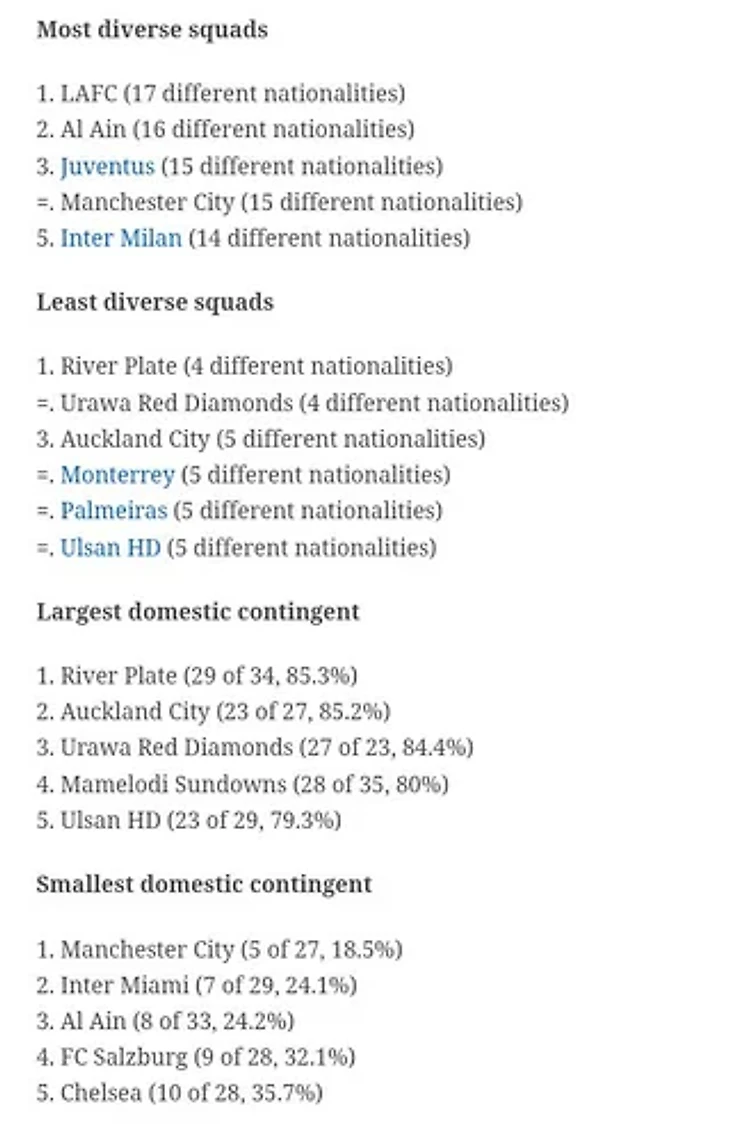 Самая интернациональная команда у представителя МЛС «Лос-Анджелеса» − игроки 17 разных национальностей. Далее идут «Аль-Айн» (16), «Ювентус» и «Манчестер Сити» (по 16), а затем «Интер» (14).