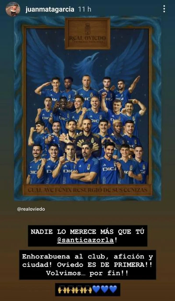 Одним из первых поздравил Касорлу Хуан Мата, его партнёр по сборной Испании, с которой они выиграли Евро-2012. Ныне игрок «Вестерн Сидней Уондерерс», Мата в детстве (с 10 до 15 лет) выступал за молодёжку «Реал Овьедо», прежде чем перейти в «Реал Мадрид», но никогда не забывал о своих астурийских корнях: «Никто не заслуживает этого больше, чем ты, Санти Касорла. Поздравляю клуб, болельщиков и город! «Овьедо» в Примере! Мы вернулись... наконец-то!» — написал Мата в соцсетях, сопроводив пост синими сердцами и кадрами празднования.