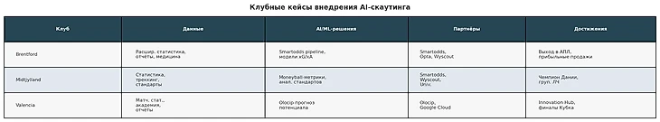 Практические примеры внедрения AI в скаутинге варьируются от богатых клубов АПЛ до небольших команд и национальных федераций. Одним из самых известных кейсов является успех небольших клубов, применивших data-driven подход для конкуренции с грандами.