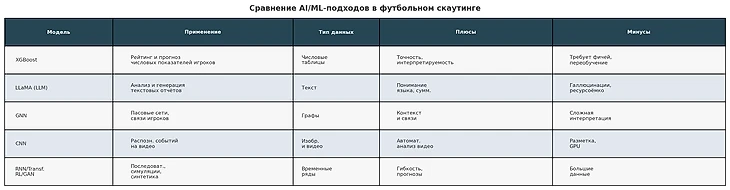 Итак, технологический стек AI-скаутинга включает хранилища больших данных, вычислительные облачные мощности, классические ML-алгоритмы (градиентный бустинг, нейросети, методы кластеризации), графовые модели и новейшие генеративные сети для NLP. Все это работает в комплексе, решая разные задачи. Например, BERT может проанализировать тональность отчета скаута (положительная/нейтральная/негативная), XGBoost – предсказать, сколько голов потенциально забьет форвард после перехода в команду (на основе миллионов случаев ), а GraphNet – найти структуру взаимодействий, делающую команду успешной.