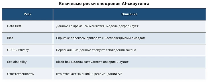 Подытоживая, проблемы AI-скаутинга требуют не меньше внимания, чем его преимущества. Необходимо:
