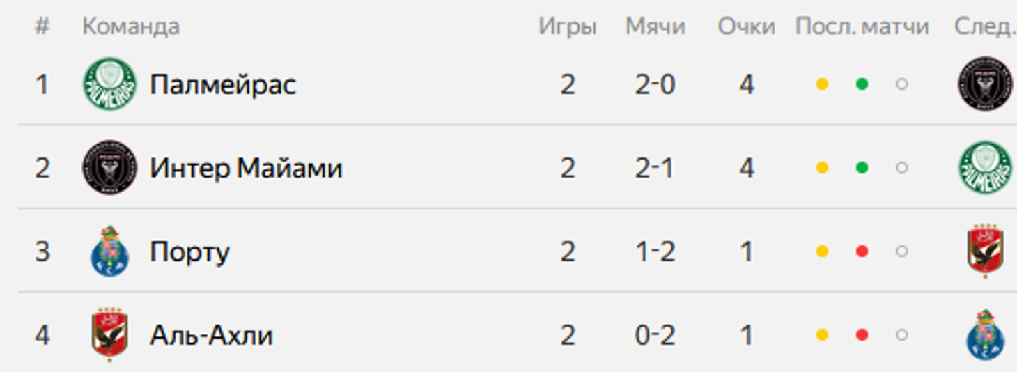 - победа над “Аль-Ахли” с минимальным счётом при крупном поражении “Палмейраса” от “Интера” Майами,