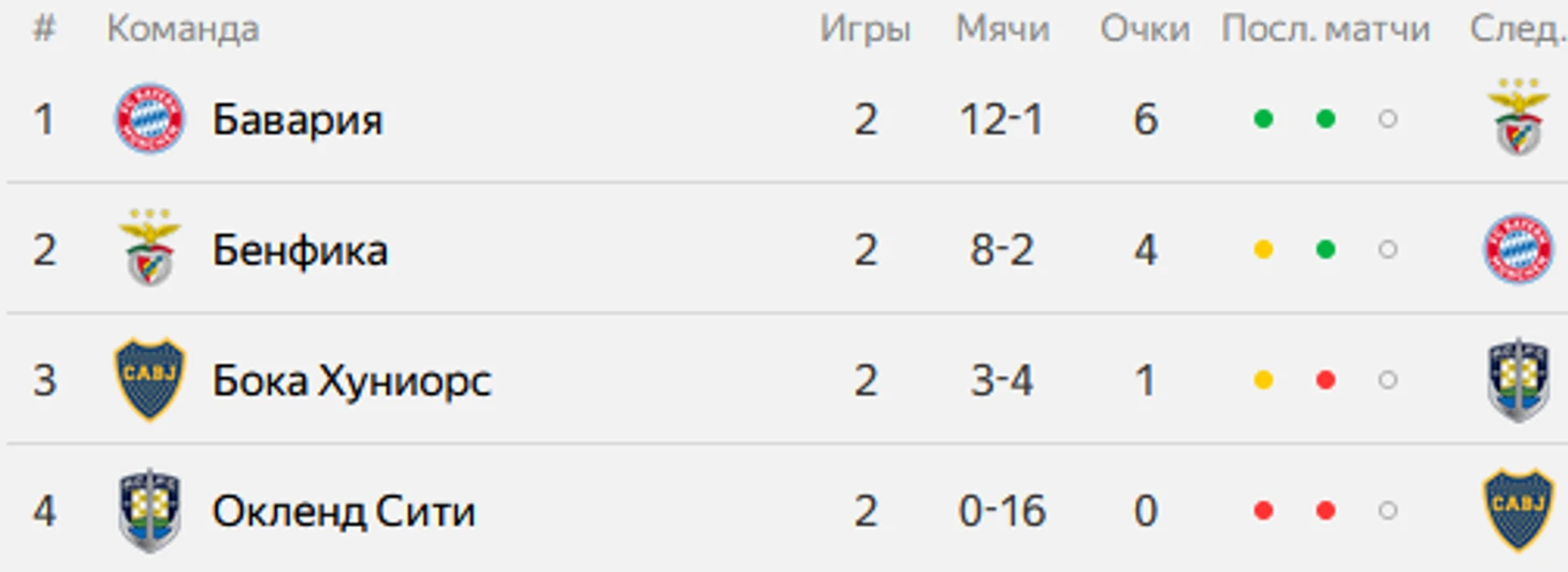 - поражение от “Баварии” с разницей в 5 мячей при минимальной победе “Боки Хуниорс” над “Оклендом”.