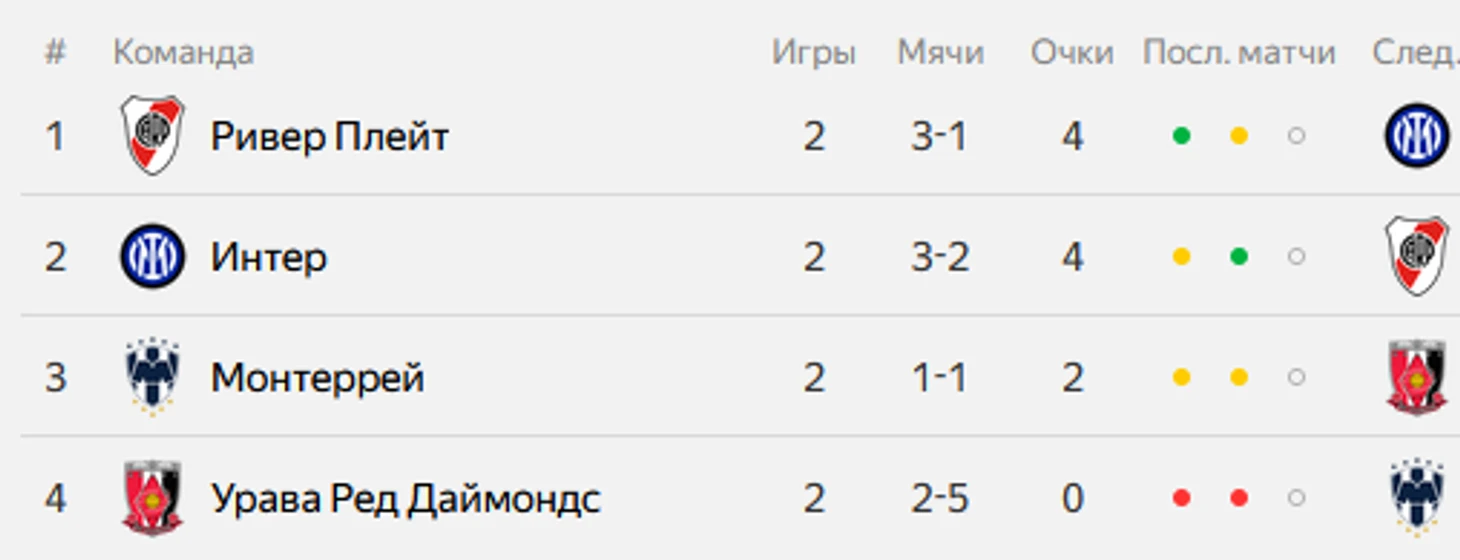 - результативная ничья с “Ривер Плейтом” при условии, что “Монтеррей” выиграет у “Урава Ред Даймондс” с разницей в один мяч, забив не больше чем “Интер” в параллельной встрече.