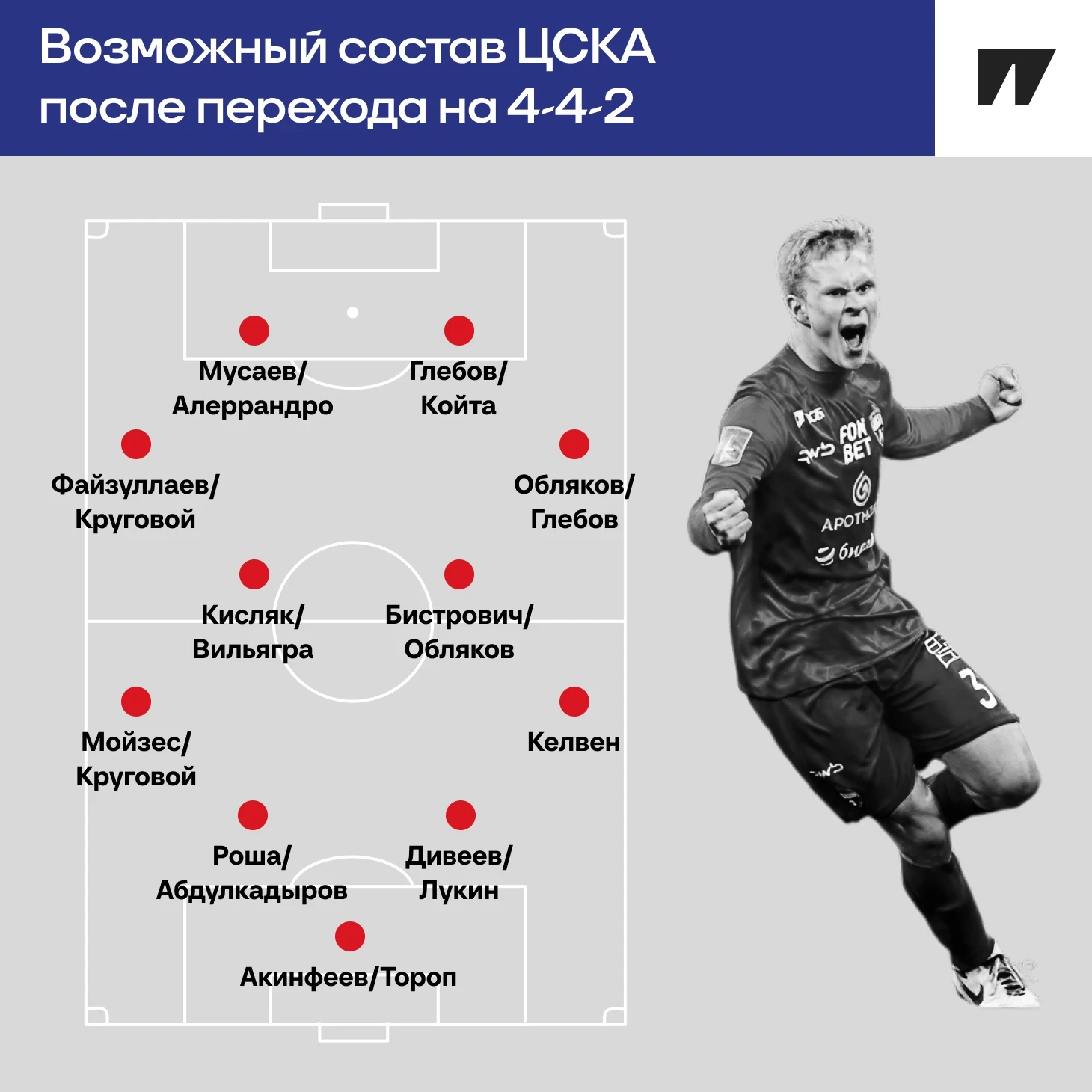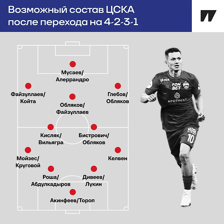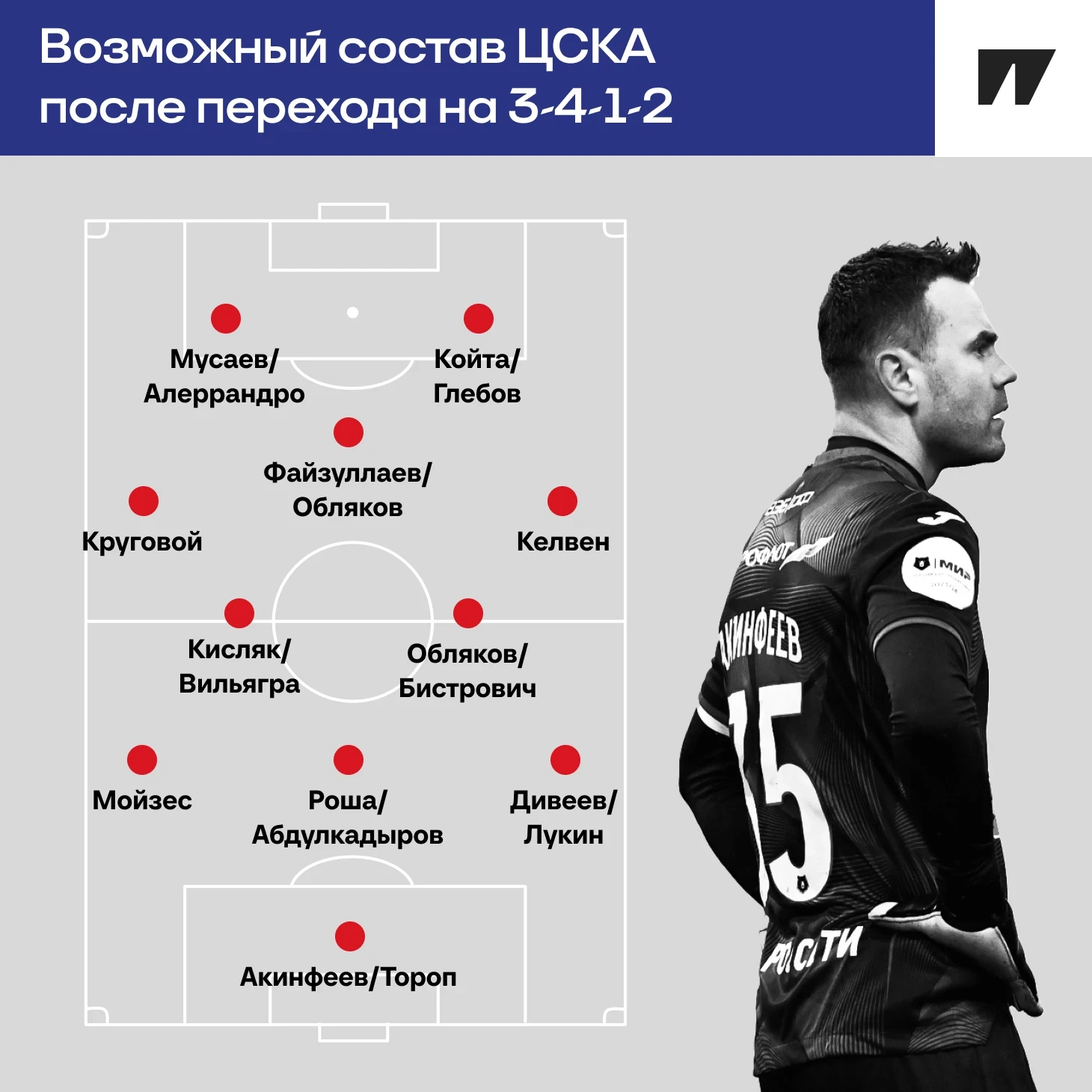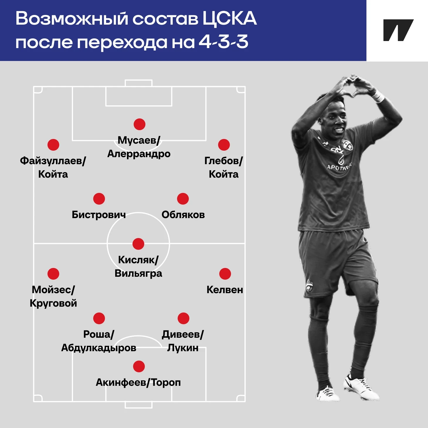 Большая часть состава ЦСКА собиралась под 3-4-3: Мойзес, Виллиан Роша и Игорь Дивеев привыкли к тройке центральных и освоили подключения вперед, Круговой и Келвен – ярко выраженные латерали, Файзуллаеву и Облякову комфортен и переход на схему с инсайдами, и игра с десяткой. В классических 3-4-3 есть возможность перевести Тамерлана Мусаева на позицию инсайда – освоил ее при Владимире Федотове.