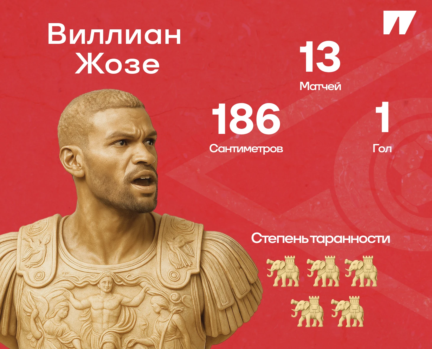 Виллиан Жозе за «Спартак» так никого и не протаранил, хотя очень хорош в этом амплуа и приехал в Россию настоящим слоном. Возможно, шансы бразильца заиграть были бы выше, если бы не голевые перформансы Манфреда Угальде.