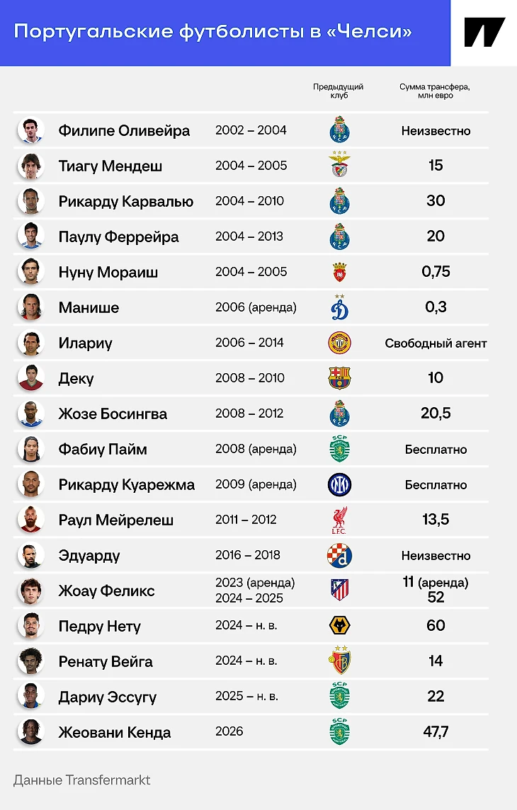 В марте «Спортинг» официально объявил о трансфере двух португальцев в «Челси». Жеовани Кенда переедет в Лондон в 2026 году за 47,7 млн евро, а Дариу Эссугу уже прибыл за 22 млн и сыграл на клубном чемпионате мира.